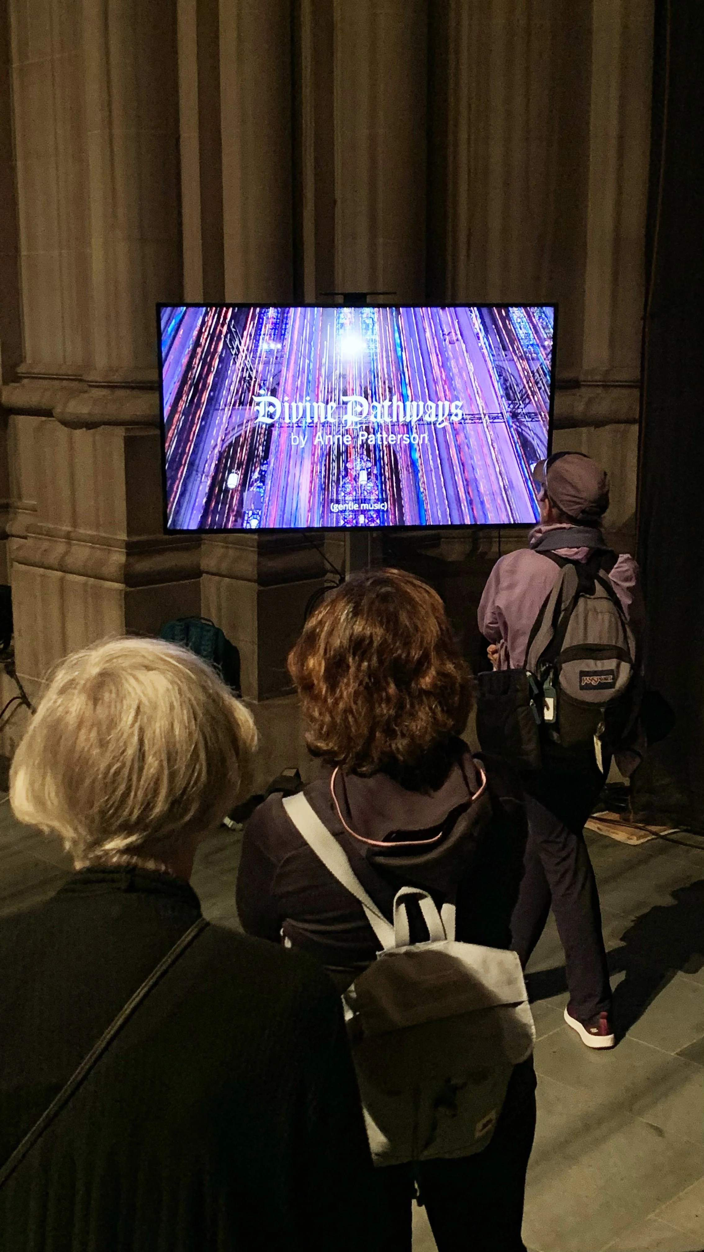 Opening night was exciting and everything you want a New York City art opening to be. Cheese, wine and a who’s who of NYC. Anne gave an exceptional speech about the work and there was an exciting dance number from the Forces of Nature Dance Theatre. The film played on two big screens inside the cathedral.