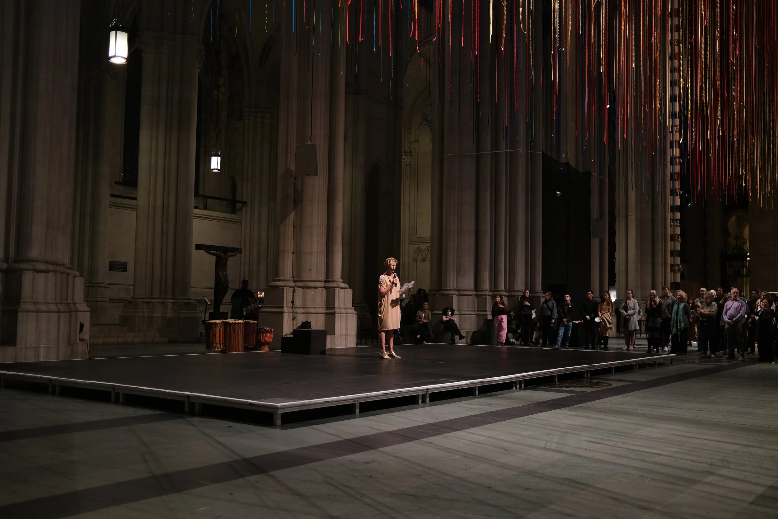 Opening night was exciting and everything you want a New York City art opening to be. Cheese, wine and a who’s who of NYC. Anne gave an exceptional speech about the work and there was an exciting dance number from the Forces of Nature Dance Theatre. The film played on two big screens inside the cathedral.